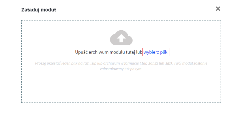 - Do okna, które zostanie wyświetlone należy przeciągnąć plik globalpayments.zip pobrany z linku powyżej lub nacisnąć wybierz plik i wskazać lokalizację pobranego pliku globalpayments.zip.