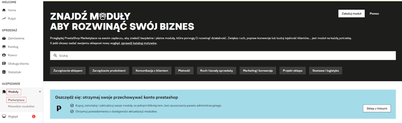 W panelu administracyjnym w menu znajdującym się po lewej stronie w sekcji ULEPSZANIE należy wybrać Moduły, a następnie Marketplace.