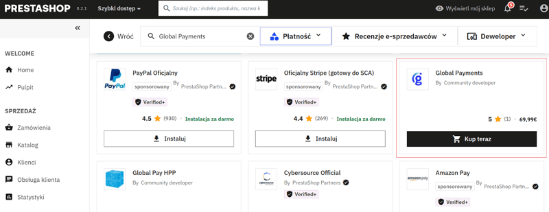 W polu wyszukiwarki należy wprowadzić frazę Global Payments a następnie, w przypadku wyboru płatnej opcji – Kup teraz, a po dokonaniu płatności przejść do instalacji i włączenia wtyczki.