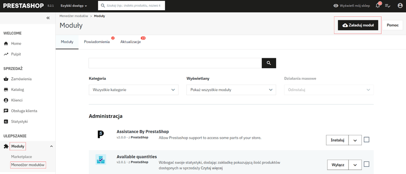 2.1 Instalacja sposób pierwszy (pobranie bezpośrednio z Marketplace PrestaShop)