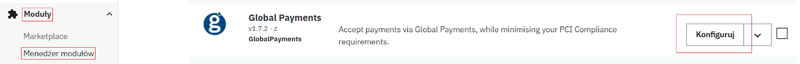 W przypadku, gdy po instalacji zdecydowano się na przełożenie jej konfiguracji, po ponownym zalogowaniu się do backoffice PrestaShop należy przejść do konfiguracji wybierając kolejno w menu znajdującym się z lewej strony panelu PrestaShop w sekcji ULEPSZANIE Moduły, następnie Menedżer modułów. Kolejno odszukaj w tej sekcji wtyczkę Global Payments znajdującą się w module Payments. Z prawej strony nazwy modułu, wybierz Konfiguruj.