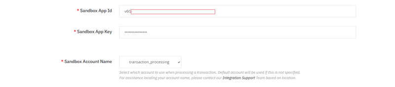 - Wprowadzić dane dedykowane dla środowiska testowego (inne niż produkcyjne) udostępnione przez eService: Sandbox App Id, Sandbox App Key oraz Sandbox Account Name.