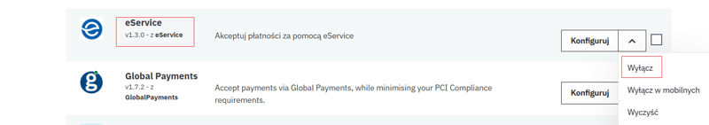 Kolejno należy odszukać kategorię Payments - znajdują się tam m.in. wtyczki: eService oraz Global Payments. Nowa nazwa wtyczki to Global Payments, poprzednią wersję, tj. eService należy wyłączyć.