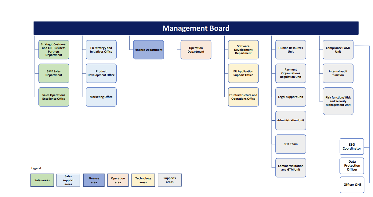 Struktura Centrum Elektronicznych Usług Płatniczych eService Sp. z o.o. składa się z wyspecjalizowanych komórek, stanowiących merytoryczne wsparcie dla Zarządu Spółki. To tu tworzą się plany i strategie dotyczące wszystkich aspektów działalności Spółki.